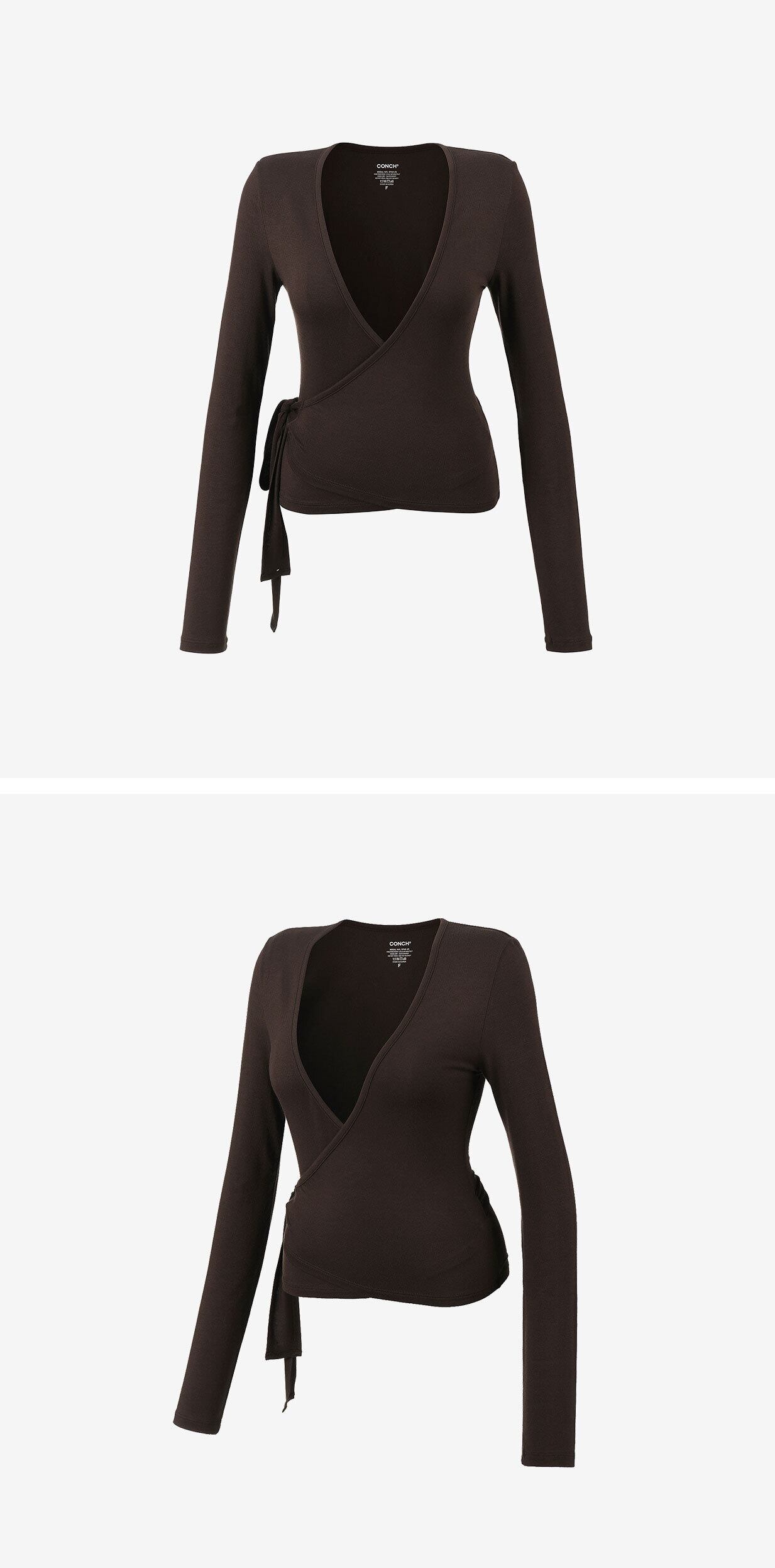 Vネックラインとラップデザインで、体を自然に包み込み上品な印象に。