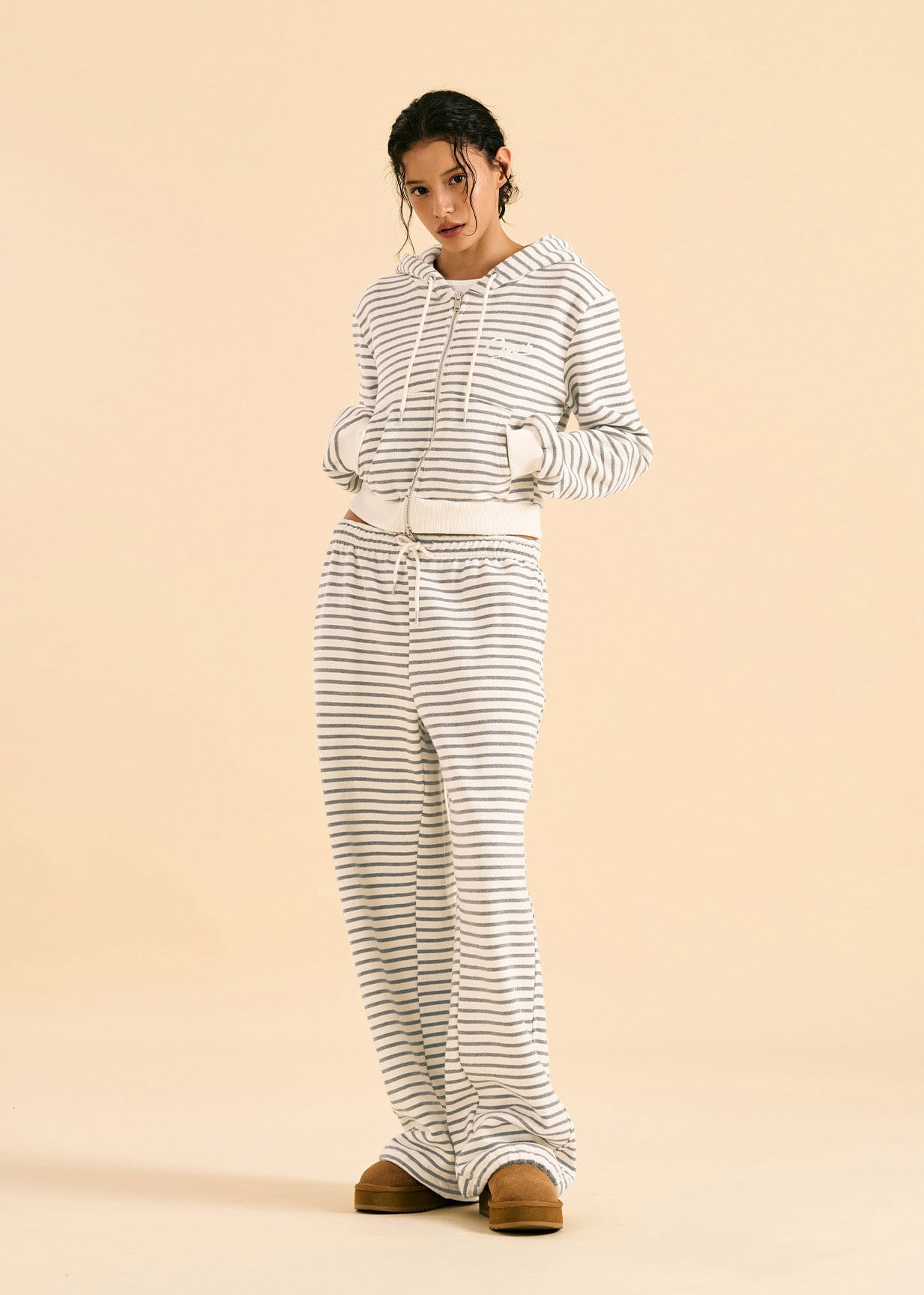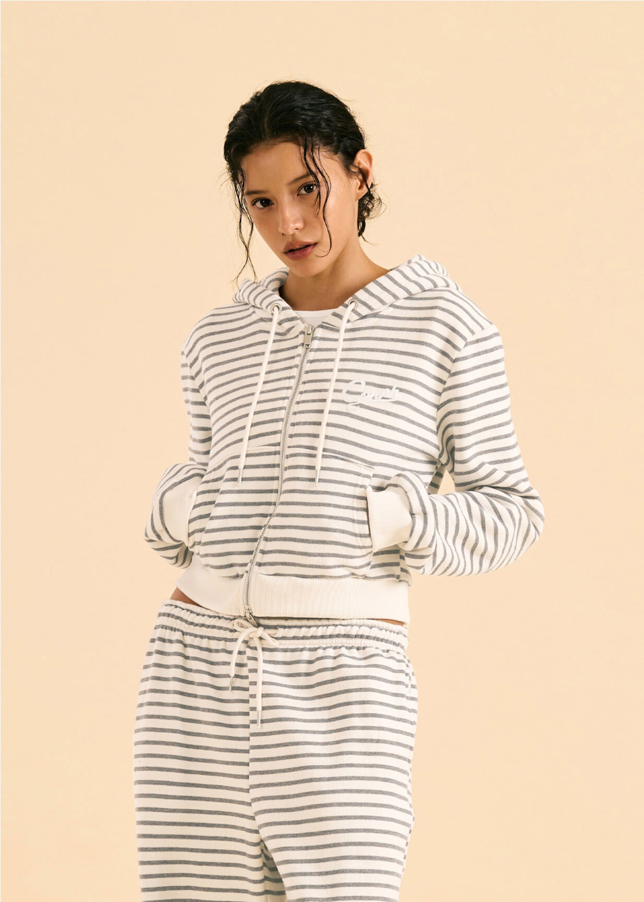 セミクロップ丈のジップフーディと、ゆるっとしたルーズフィットのスウェットパンツを組み合わせ、韓国らしい抜け感をまとえる1セットです。