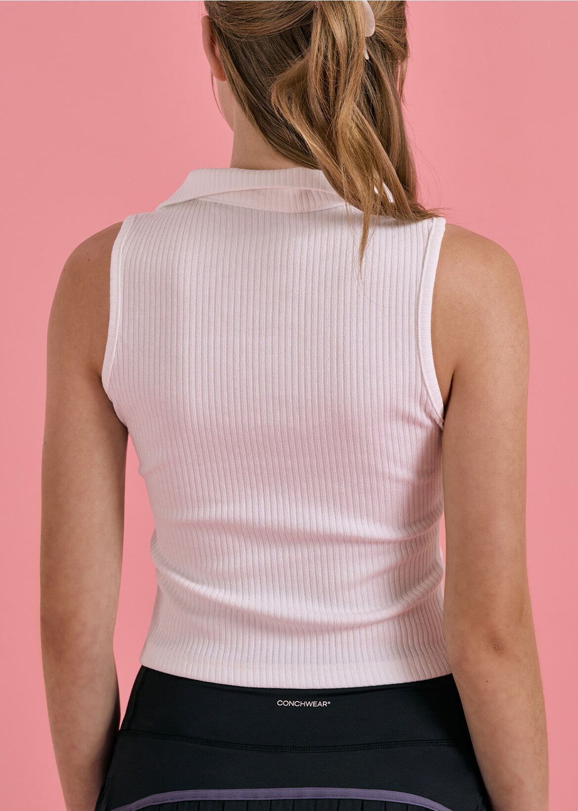 ほどよくフィットするリブ編み素材を使用した、伸縮性の高いスリーブレストップ。